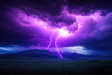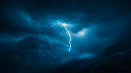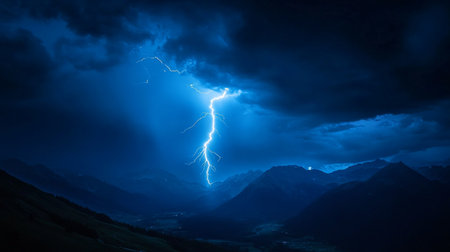 A breathtaking view of a lightning bolt striking the mountains during a thunderstorm, showcasing the raw power of nature with dark storm clouds and illuminated landscape.