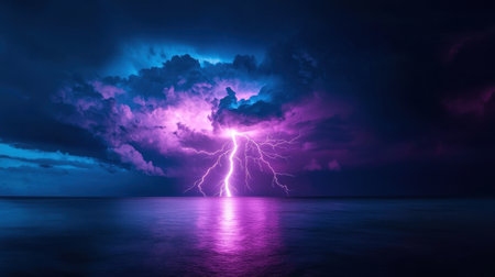 A dramatic scene showcasing a powerful lightning strike over a serene ocean at dusk. The vibrant purple and blue hues create a captivating atmosphere, showcasing nature's might.