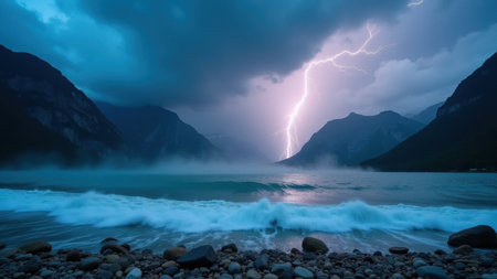 A powerful thunderstorm unfolds over a pristine alpine lake, with dramatic dark clouds and electrifying flashes of lightning. The usually calm waters are now turbulent, creating waves and foamy crests. The rocky shoreline contrasts with the dense fog rising from the agitated water, while majestic mountains stand in the background, partially hidden by the dramatic weather.