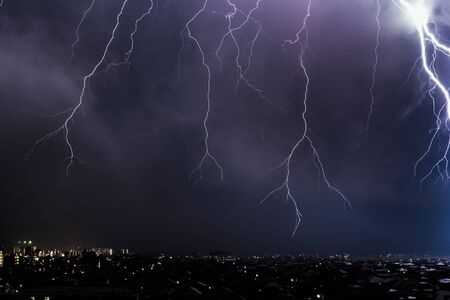 Purple or blue horizontal lightning in the night sky in black clouds over the city. A real photo of a thunderstorm. The concept of meteorology.