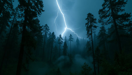 Majestic Lightning Strike Night Forest Dark Trees Nature Powerful Storm Dramatic Sky Blue Nighttime