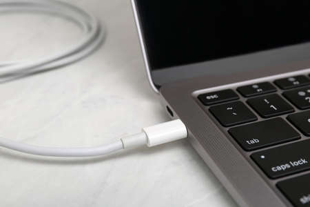 Barcelona, Spain - January 2022. MagSafe 3 power adapter for new laptop. Macro view of charger for MacBook on Apple logo. Metal silver background