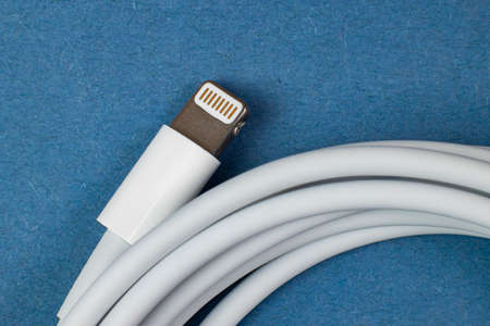 Apple Lightning cabel closeup on the white background. Apple Lightning Connector used to connect mobile devices iPhones, iPads and iPods to host computers. Moscow, Russia - November 25, 2019