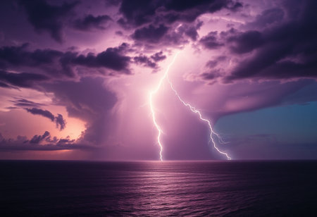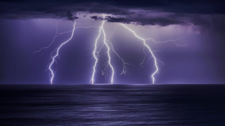 A dramatic scene showcasing a powerful lightning strike over a serene ocean at dusk. The vibrant purple and blue hues create a captivating atmosphere, showcasing nature's might.