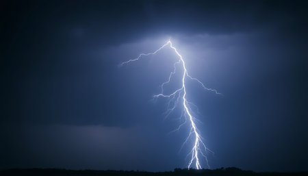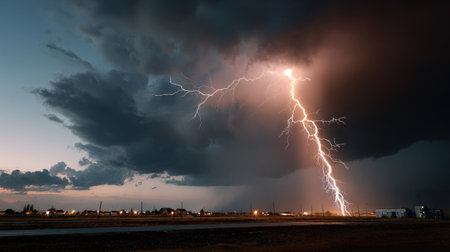 Captivating image of a stunning lightning strike cutting through a dark, stormy sky over a rural landscape at dusk, showcasing the raw power of nature.