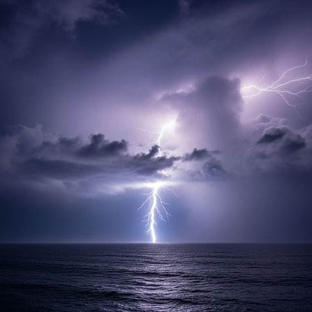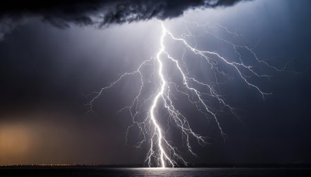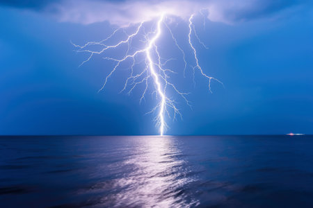 A lightning bolt is seen over the ocean in a dark sky, AI