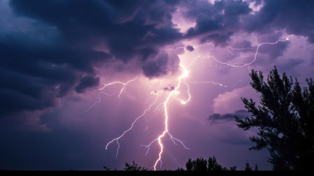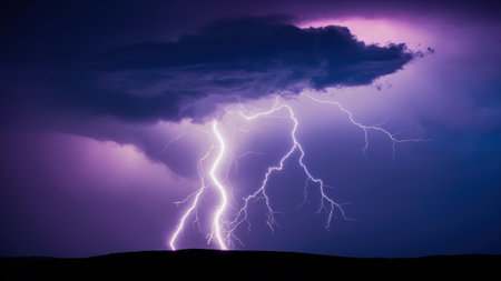 AI Generated. Spectacular lightning illuminates a purple stormy sky during a summer night over a quiet landscape