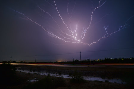 Dramatic Lightning Strikes Across a Dark Sky Illuminating a Wet Road During a Thunderstorm at Dusk