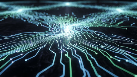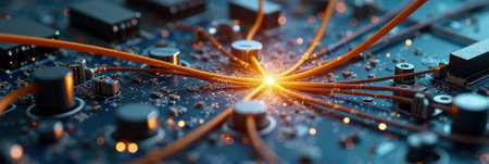 Glowing network cables integrated on circuit board for data transmission. That the image is generated using AI.