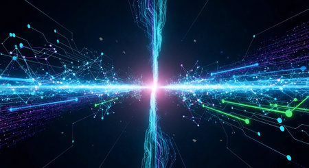 Abstract digital visuals display glowing lines and particles in motion, illustrating a continuous flow of light and energy in a dark environment