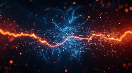 A Digital illustration of abstract lightning with vibrant colors and geometric patterns, representing energy and technology