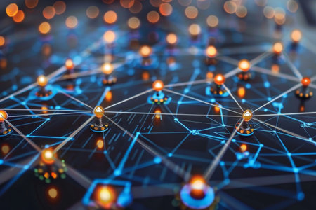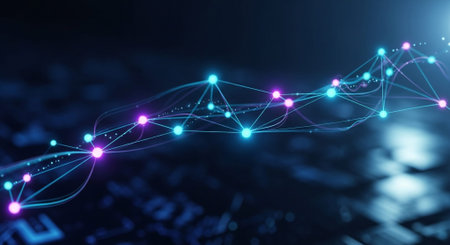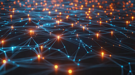 Glowing nodes connected by lines create a digital network design against a dark background.