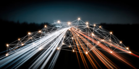 An artistic representation of a digital connection network displayed over dynamic light trails in a dark night scenario, symbolizing technology and movement.