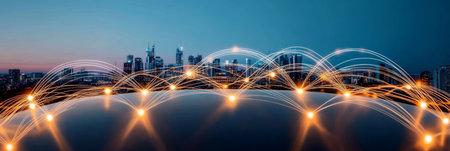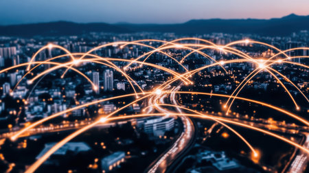 Smart city network connectivity urban nightscape glowing arcs over highways creating resilient