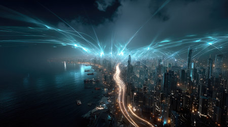 A vibrant cityscape illuminated at night with intricate web of digital connections linking various points, symbolizing advanced communication and technology infrastructure.