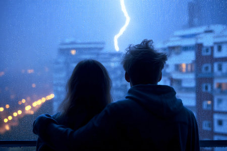 A couple stands close together by a window, hugging while watching a thunderstorm. Bright lightning lights up the dark sky and rain splatters against the glass.