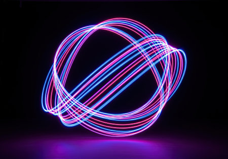 Abstract glowing neon light trails forming circular artistic shape on dark background.