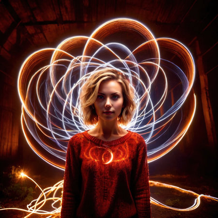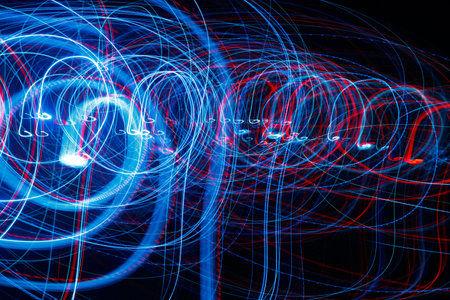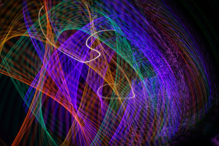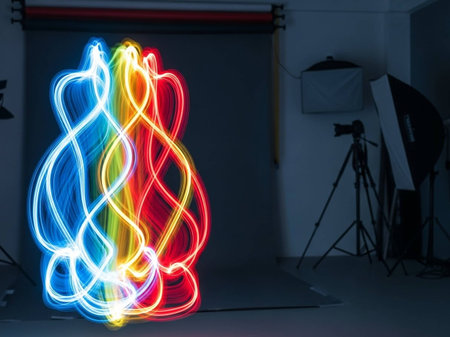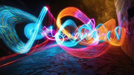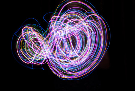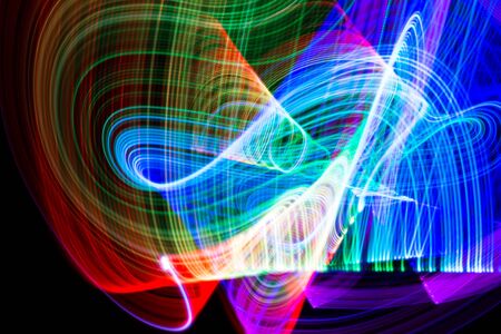 A dynamic photo of light painting, with colorful light trails forming abstract shapes in a dark environment
