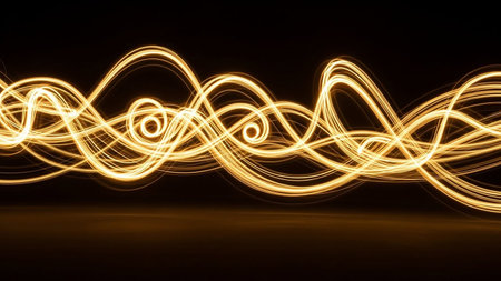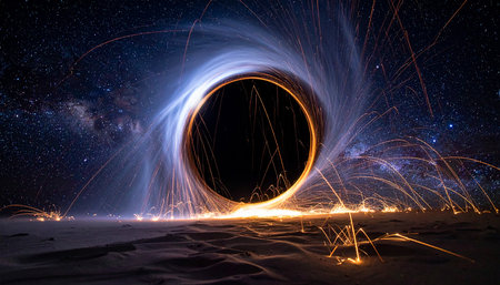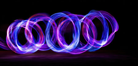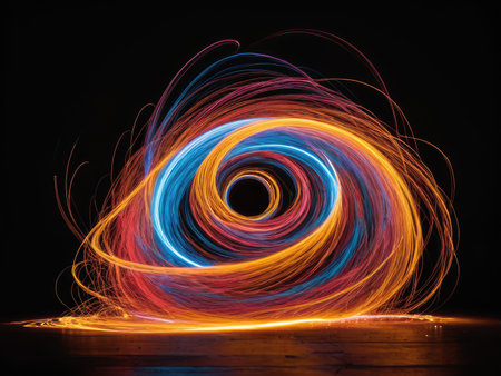 A stunning visual representation of energy and movement, showcasing glowing orange light trails creating dynamic circular shapes against a rich black background.