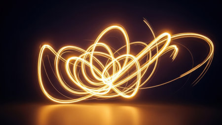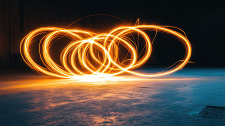 Captivating display of light trails, created by moving light sources, forming interwoven circles against a dark backdrop. The circles are a warm orange-yellow color, suggesting a fiery or energetic quality. The trails are smooth and flowing, and the surface below is a dark gray-blue.