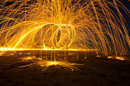 Sparks from spinning steel wool at night. Long exposure.