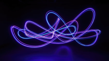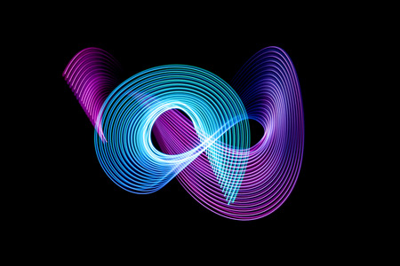 An abstract artwork features glowing trails in the shape of interconnected spirals, predominantly in shades of purple and blue. The composition is set against a stark black background. The image's vibrant colors and dynamic forms suggest artistic creativity, suitable for various design projects and visual content.