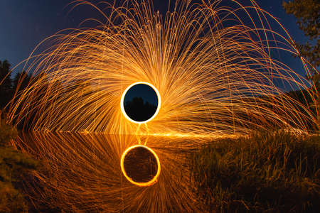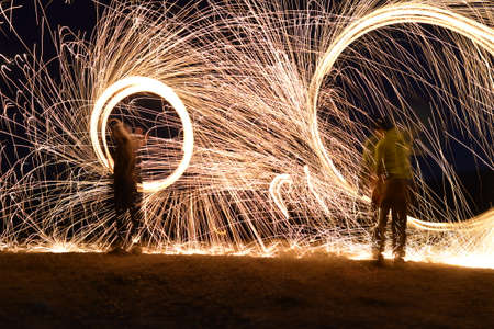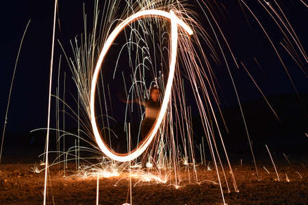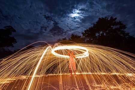 Iron wool circle drawing light fireworks. Burning Steel Wool spinning, Trajectories of burning sparks at night. Movement light effect, steel wool fire hoop. long exposure light painting, Pyrotechnic