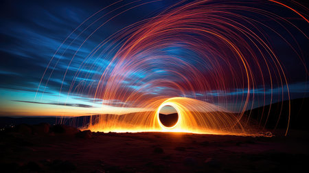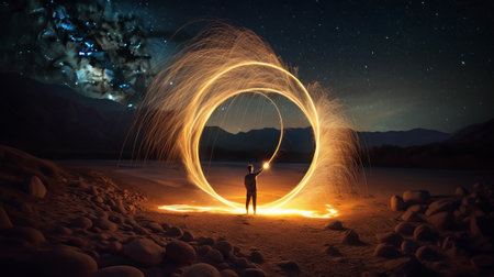 A person is spinning a fiery circle in the air, creating a mesmerizing light display against the night sky
