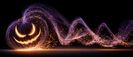 Enchanting Halloween scene of a glowing pumpkin casting a swirling purple-orange light trail across dark sand with glittering bokeh background.