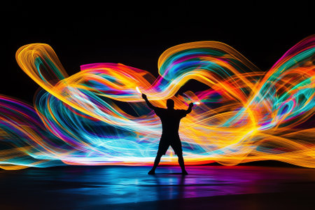 A silhouette dances gracefully against a vivid backdrop of vibrant light trails, creating a mesmerizing visual. Generative AI