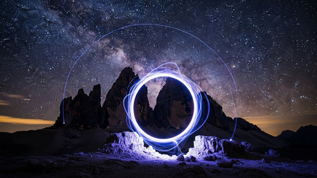 A view of a star-filled night sky, dominated by the luminous band of the Milky Way galaxy, stretches above a dramatic range of jagged mountain peaks. In the foreground, a vibrant, glowing blue circle of light, created through light painting, hovers and frames the scene. The mountains are silhouetted against the celestial backdrop, with illuminated rock formations at their base. The overall mood is mystical and awe-inspiring, blending the grandeur of the cosmos with the rugged beauty of the...