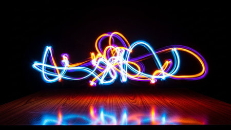 is a vibrant example of light painting, created using long exposure It a series of dynamic, colorful light trails in neon green, pink, and blue, swirling and curving across a dark background. The light trails are cast upon a reflective surface, likely a wooden table, which mirrors the colors and adds depth to the composition. The contrast between the bright, energetic light lines and the dark surroundings creates a striking visual effect. The evokes a sense of movement, creativity, and...