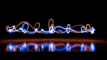 is a vibrant example of light painting. Swirling lines of blue and orange light create an energetic and dynamic abstract pattern against a completely black background. The light trails are fluid and organic, suggesting movement and creativity. Below the light painting, a polished wooden surface reflects the glowing colors, doubling the visual impact. The contrast between the bright, luminous lines and the dark setting is striking.