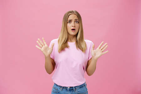 Woman looking nervous explaining with panicking gestures she not involved frowning opening mouth and gasping feeling concerned and worried waving hands over chest posing against pink wall