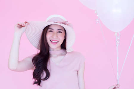 Happy beauty girl laughing with white balloons on pink background, Young woman celebrating on birthday party or having fun in holiday, Asian thai model