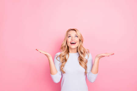 Omg, it is unbelievable! Portrait of astonished emotional girl looking up at copy space, empty place with open mouth isolated on pink background