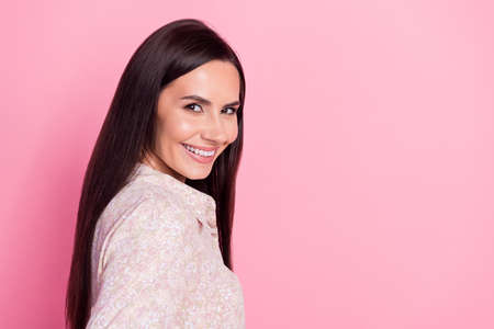 Closeup photo of young attractive smiling lady looking you recommend new surgery medicine ad isolated on pink color background