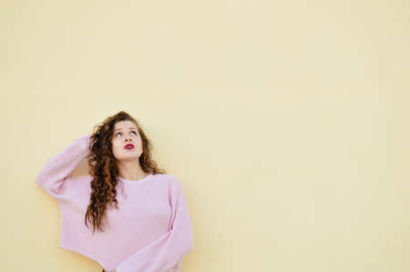 Portrait of a beautiful girl in a pink sweater on a pink background.
