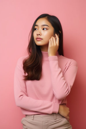Side of view lovely Asian student young lady in pink hoodie sweatshirt posing isolated on over pink studio background. Good offer for ad. Fashion New Collection concept. Copy space