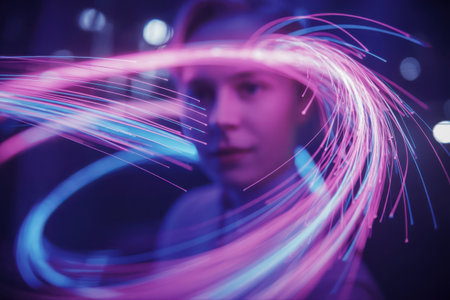 A low-angle close-up shot captures a woman's face partially obscured by vibrant, swirling neon lights. The colorful streaks of light create a dynamic and ethereal effect around her head and shoulders.