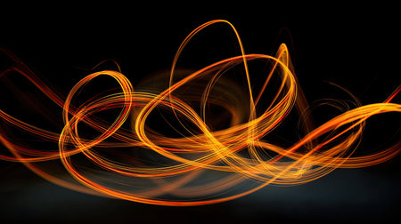 A mesmerizing display of colorful light trails swirls gracefully against a deep black background, creating a sense of movement and energy. The vivid hues of orange, blue, and green intertwine, evoking a feeling of dynamism and creativity, perfect for modern design projects.