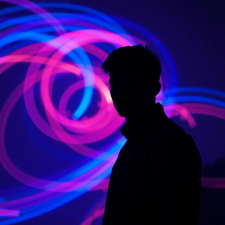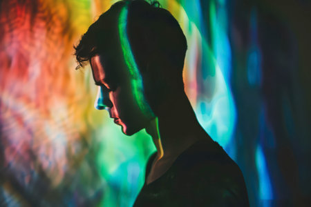 A young person stands in profile, enveloped by vibrant, swirling colors that cast beautiful light patterns on the wall around them. The interplay of hues creates a captivating backdrop that enhances the introspective atmosphere of the moment.
