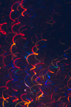Abstract background of colorful curls in motion on black. Bokeh of defocused blue and red curves, blurred rainbow neon leds, festive backdrop of holidays, serpentine and celebrations