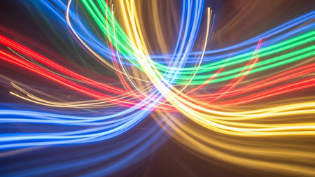 Abstract streaks of colorful light trails in motion create a dynamic and energetic pattern against a dark background.