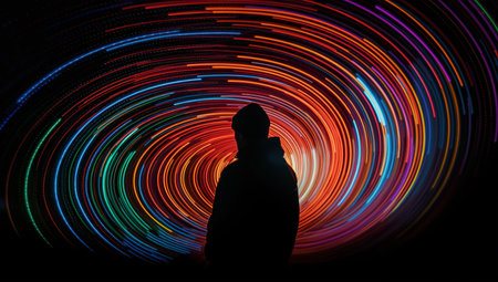 A woman with a tied-back hairstyle stands in profile against a vibrant backdrop of swirling lights. The colors of red and white create a dynamic effect as they spiral around her figure, highlighting her silhouette. The scene evokes a sense of wonder and movement, capturing an enchanting moment during nighttime.