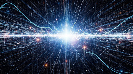 A dynamic abstract scene with intense blue and white light streams and numerous small particles emanating from a central light source in a dark void.