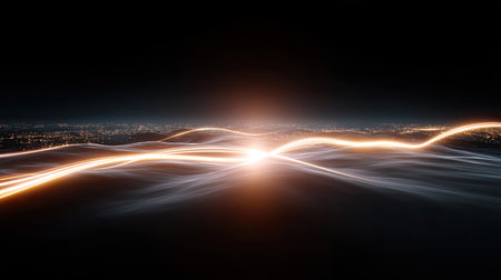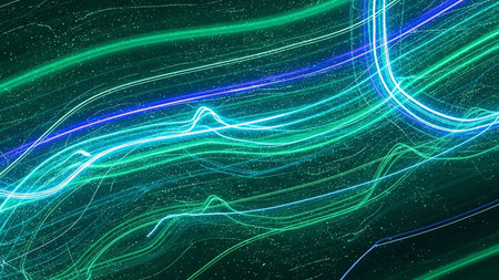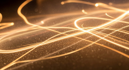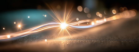 An abstract representation of light trails with sparkling effects glowing on a surface
