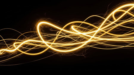 This image captures a mesmerizing display of golden light trails against a dark background. The light trails intertwine and loop, creating an abstract pattern that evokes a sense of motion and fluidity. The contrast between the bright, glowing lines and the surrounding darkness adds to the visual impact, making the image both dynamic and captivating.