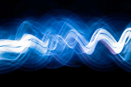 Blue, red, white and purple light painting photography, long exposure, ripples and waves against a black background. Curves and waves of neon green light against a black background.