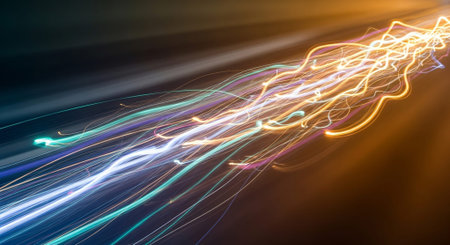 Colorful light trails in motion, vibrant neon streaks creating an energetic and dynamic abstract background